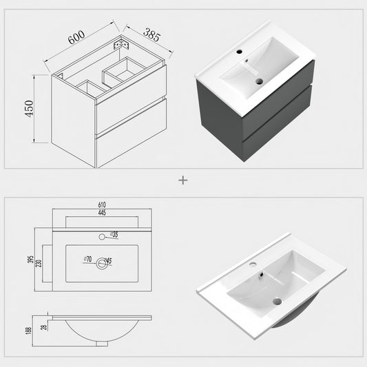 Badmöbel Set 60cm Waschbecken mit Unterschrank Waschtisch Standschrank Anthrazit