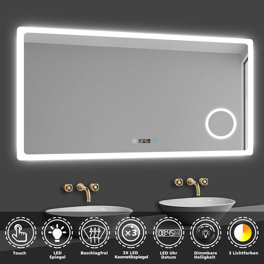 Badspiegel 100x60 cm Kalt/Warm/Neutralweiß+Uhr+Beschlagfrei+3x Makeup-spiegel+dimmbar+Helligkeit-Speicherfunktion