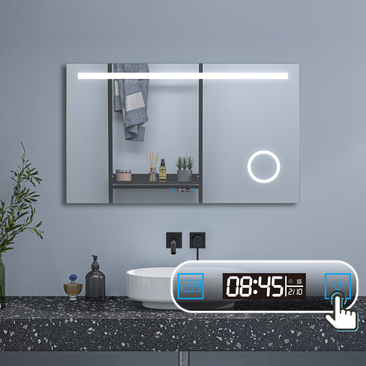 LED Badspiegel 100×70cm Wandspiegel mit Uhr, Touch, Beschlagfrei,3-Fach Vergrößerung Schminkspiegel IP44 Kaltweiß energiesparend