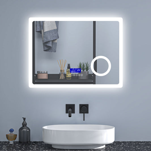 Badspiegel 80x60 cm Uhr+Beschlagfrei+3xSchminkspiegel+Kalt/Neutral/Warmweiß+Bluetooth