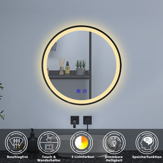 LED Badspiegel Rund Spiegel mit Beleuchtung Warm/Neutral/Kaltweiß Schwarz Rahmen 80cm