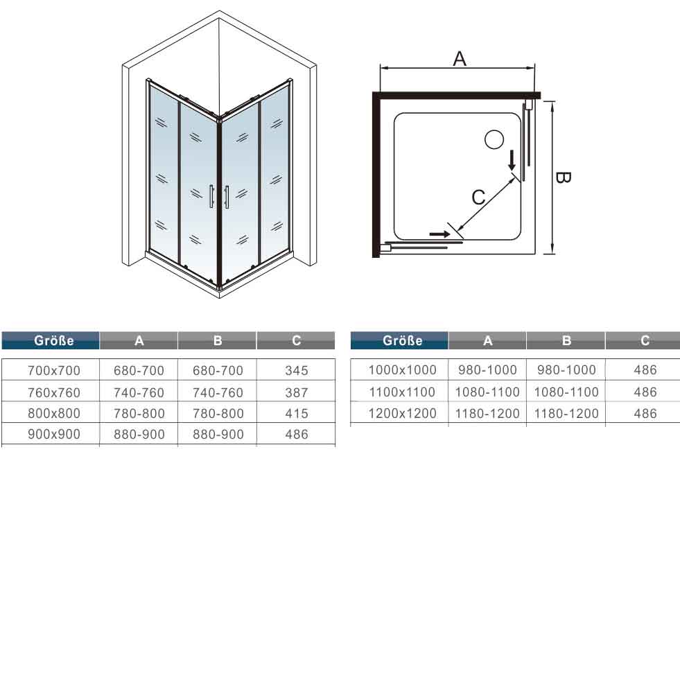 Achtung: Bei den Abmessungen handelt es sich immer um Außenmaße (inkl. Wandprofil, Glasscheibe und 20mm ins Minus Verstellbereich), bitte messen Sie nach, ob diese Duschabtrennung in den vorgesehenen Raum passt! | |