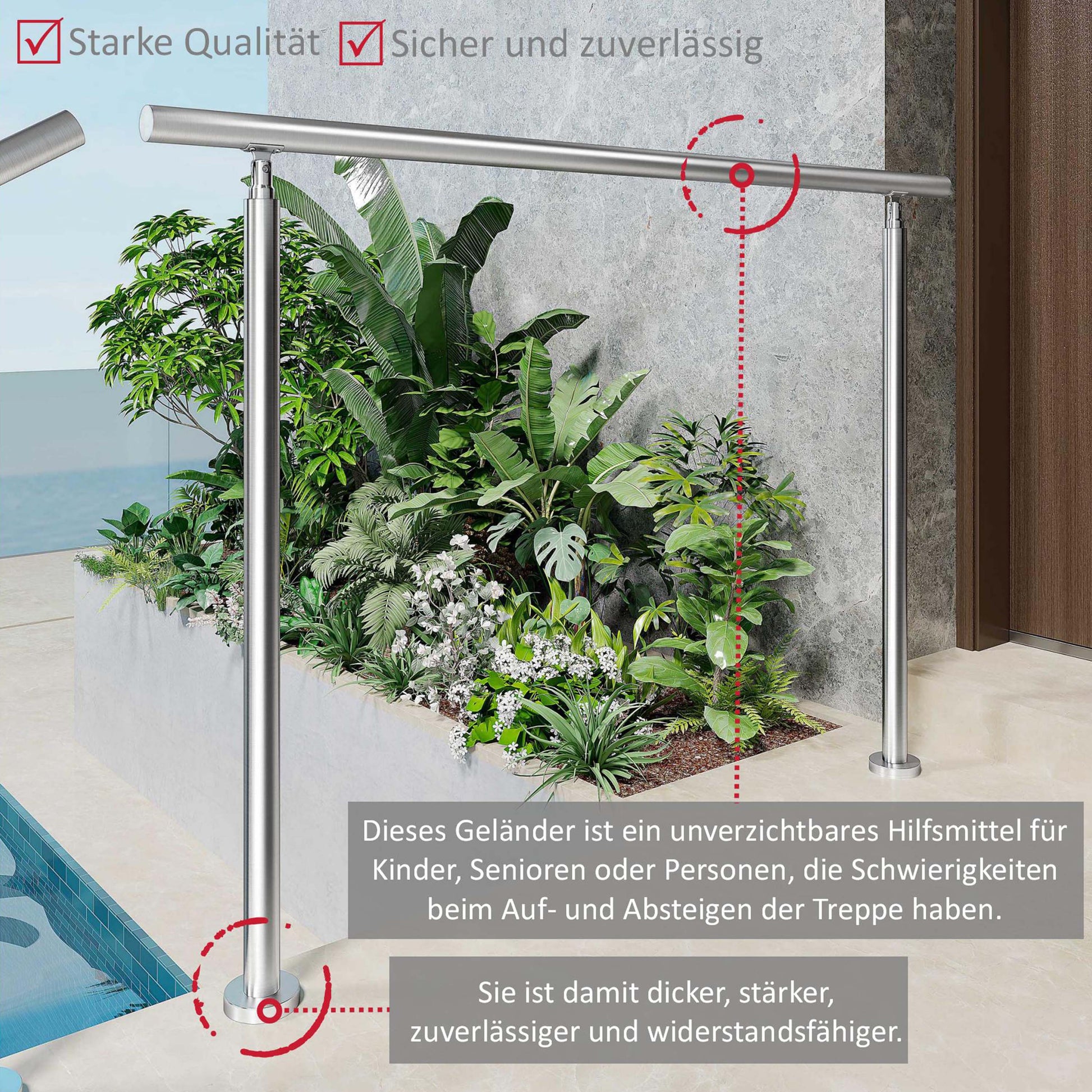 【Hochwertige Qualität】Der Handlauf ist aus Edelstahl 304 mit gebürsteter Oberfläche gefertigt. Er ist sehr hart, unzerstörbar, wetterbeständig und zeichnet sich durch hohe Schmutz-, Säure-, Korrosions- und Abriebfestigkeit sowie Strahlen- und Rostbeständigkeit aus.