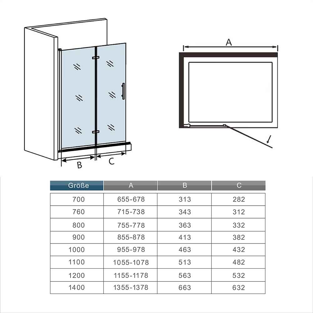 Achtung: Bei den Abmessungen handelt es sich immer um Außenmaße (inkl. Wandprofil, Glasscheibe und Minus Verstellbereich), bitte messen Sie nach, ob diese Duschabtrennung in den vorgesehenen Raum passt!