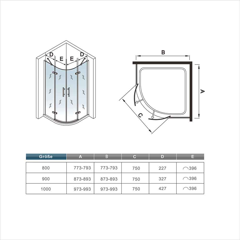 Achtung: Bei den Abmessungen handelt es sich immer um Außenmaße (inkl. Wandprofil, Glasscheibe und Minus Verstellbereich), bitte messen Sie nach, ob diese Duschabtrennung in den vorgesehenen Raum passt!