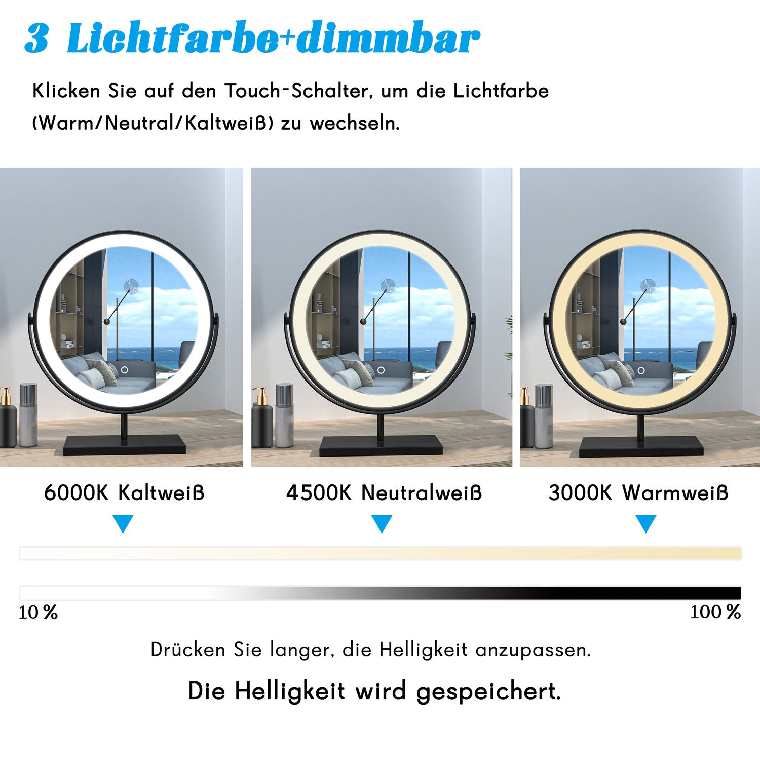 Drei Lichtfarbe und Dimmbar: Der Schminkspiegel mit Beleuchtung verfügt über Warm/Tages/Kaltweiß. Sie können auch die Helligkeit des Lichts durch langes Drücken einstellen, und diese Helligkeit wird aufgezeichnet.