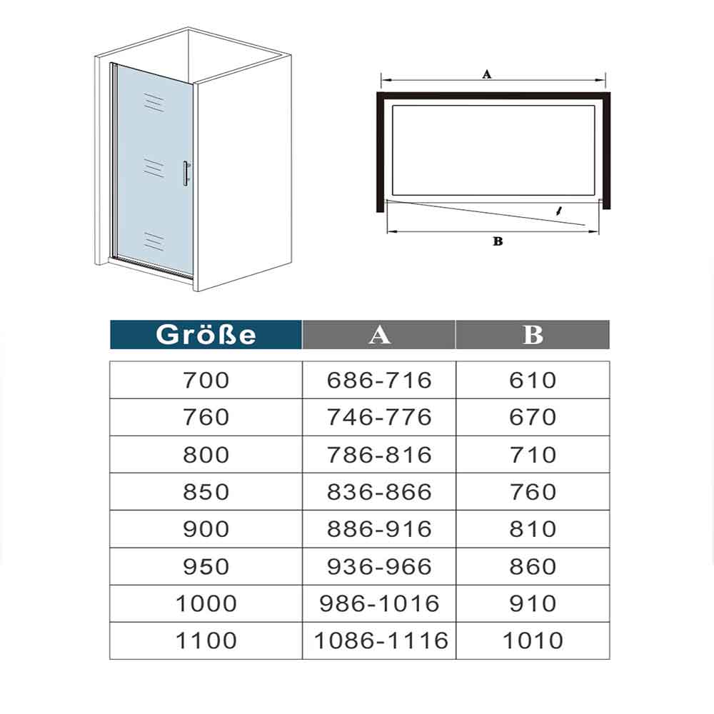Achtung: Bei den Abmessungen handelt es sich immer um Außenmaße (inkl. Wandprofil, Glasscheibe und 30mm ins Minus Verstellbereich), bitte messen Sie nach, ob diese Duschabtrennung in den vorgesehenen Raum passt! | |