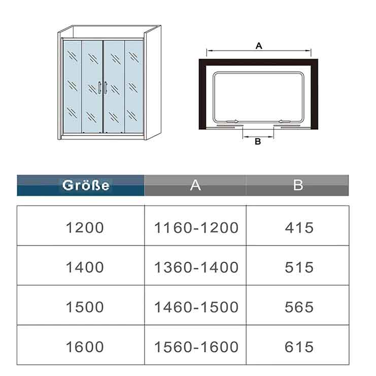Achtung: Bei den Abmessungen handelt es sich immer um Außenmaße (inkl. Wandprofil, Glasscheibe und Minus Verstellbereich), bitte messen Sie nach, ob diese Duschabtrennung in den vorgesehenen Raum passt!