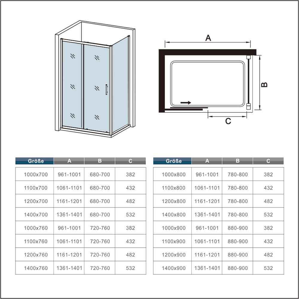 Achtung: Bei den Abmessungen handelt es sich immer um Außenmaße (inkl. Wandprofil, Glasscheibe und Minus Verstellbereich), bitte messen Sie nach, ob diese Duschabtrennung in den vorgesehenen Raum passt!