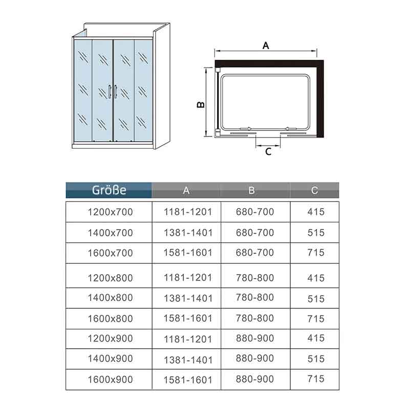 Achtung | Bei den Abmessungen handelt es sich immer um Außenmaße (inkl. Wandprofil, Glasscheibe und 20mm ins Minus Verstellbereich), bitte messen Sie nach, ob diese Duschabtrennung in den vorgesehenen Raum passt! |