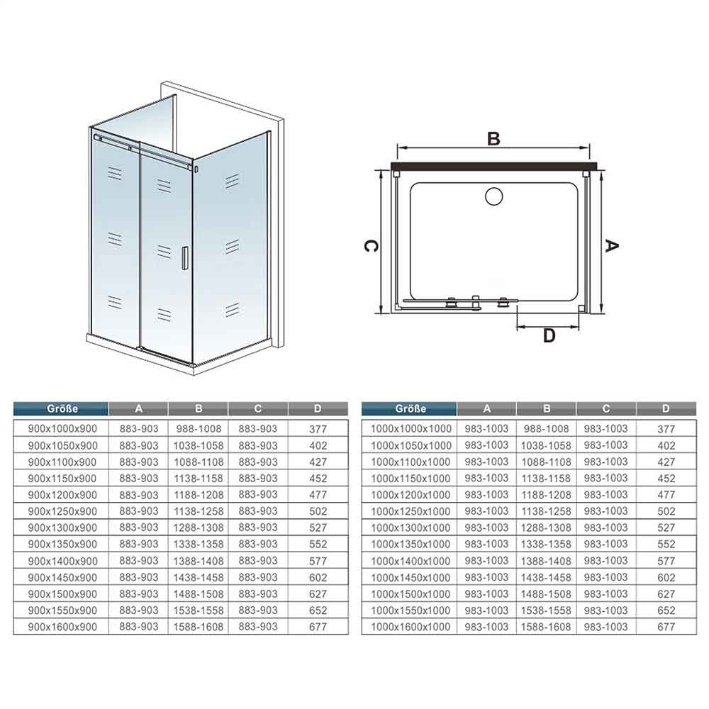 Achtung: Bei den Abmessungen handelt es sich immer um Außenmaße (inkl. Wandprofil, Glasscheibe und Minus Verstellbereich), bitte messen Sie nach, ob diese Duschabtrennung in den vorgesehenen Raum passt!