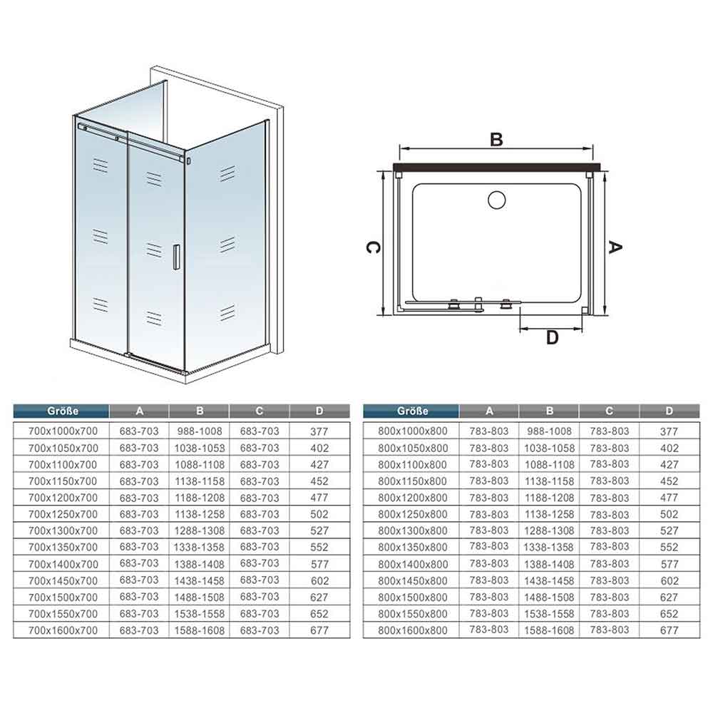 Achtung: Bei den Abmessungen handelt es sich immer um Außenmaße (inkl. Wandprofil, Glasscheibe und Minus Verstellbereich), bitte messen Sie nach, ob diese Duschabtrennung in den vorgesehenen Raum passt!