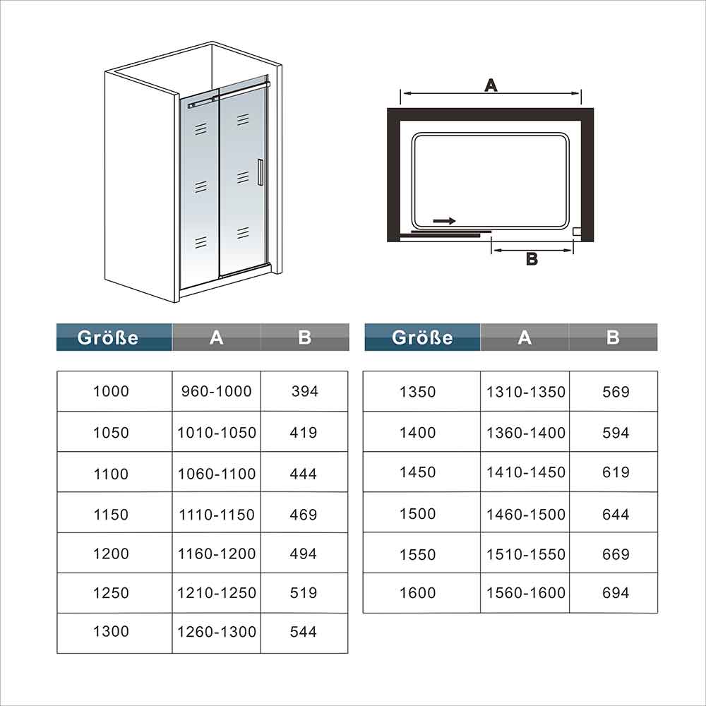 Achtung: Bei den Abmessungen handelt es sich immer um Außenmaße (inkl. Wandprofil, Glasscheibe und Minus Verstellbereich), bitte messen Sie nach, ob diese Duschabtrennung in den vorgesehenen Raum passt!