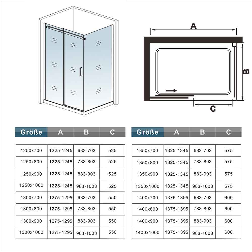 Achtung: Bei den Abmessungen handelt es sich immer um Außenmaße (inkl. Wandprofil, Glasscheibe und Minus Verstellbereich), bitte messen Sie nach, ob diese Duschabtrennung in den vorgesehenen Raum passt!
