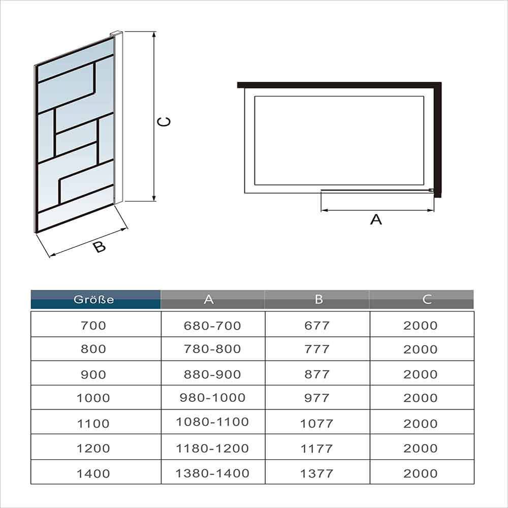 Achtung: Bei den Abmessungen handelt es sich immer um Außenmaße (inkl. Wandprofil, Glasscheibe und Minus Verstellbereich), bitte messen Sie nach, ob diese Duschabtrennung in den vorgesehenen Raum passt!