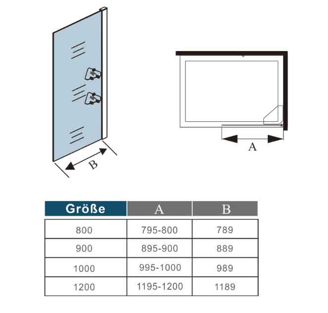 Achtung: Bei den Abmessungen handelt es sich immer um Außenmaße (inkl. Wandprofil, Glasscheibe und 20mm ins Minus Verstellbereich), bitte messen Sie nach, ob diese Duschabtrennung in den vorgesehenen Raum passt! | |